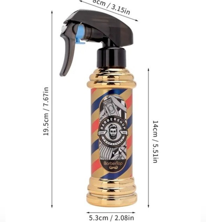 Rociador de agua para barbería en elegante diseño dorado. Resistente, práctico y con pulverización uniforme, ideal para uso profesional y dar un toque de estilo a tu barbería.
