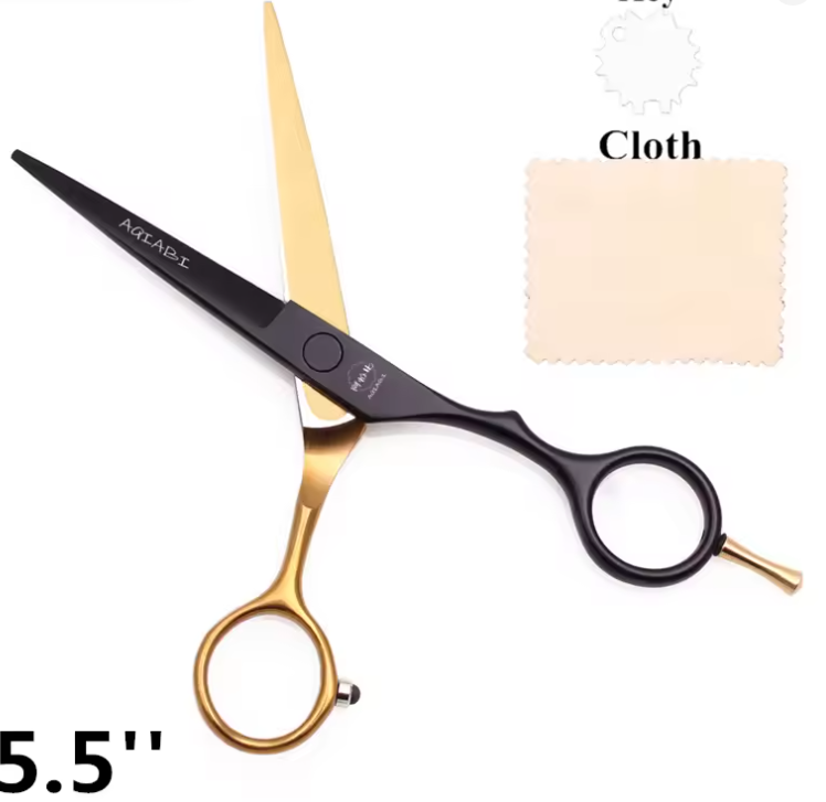 Eleva tu nivel de precisión y profesionalismo con la Tijera Aqiabi negro y dorada filo navaja, una herramienta confiable y sofisticada para todo tipo de cortes.